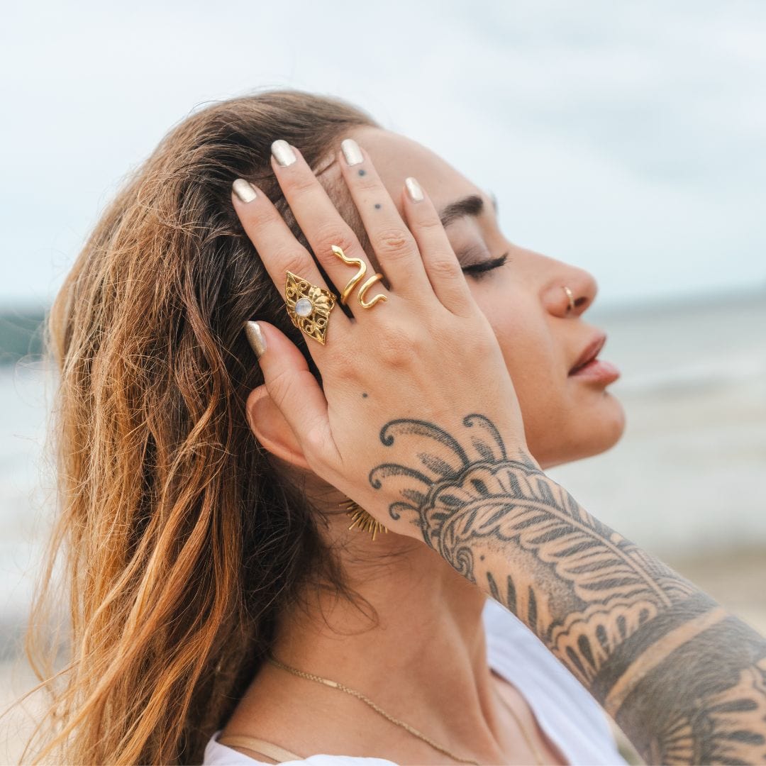 Inspired by the divine feminine energy, the Shakti Ring embodies strength in softness. Crafted from 18K gold-plated material, this adjustable ring spirals gracefully around your finger, connecting you to your inner power. Wearing this magical companion encourages you to embrace and express your feminine energy, allowing you to flow through life with strength.