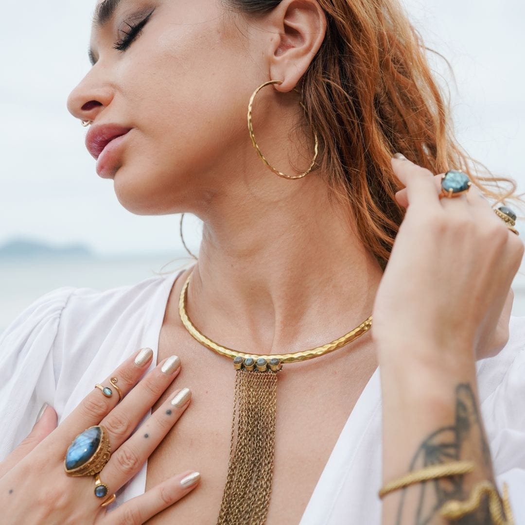 We use pure brass, 14k gold-plated brass, and 925 certified sterling silver. All materials are ethically sourced, fair trade, and 100% nickel-free to prevent skin irritation. Our artisans handcraft each piece with love and intention.