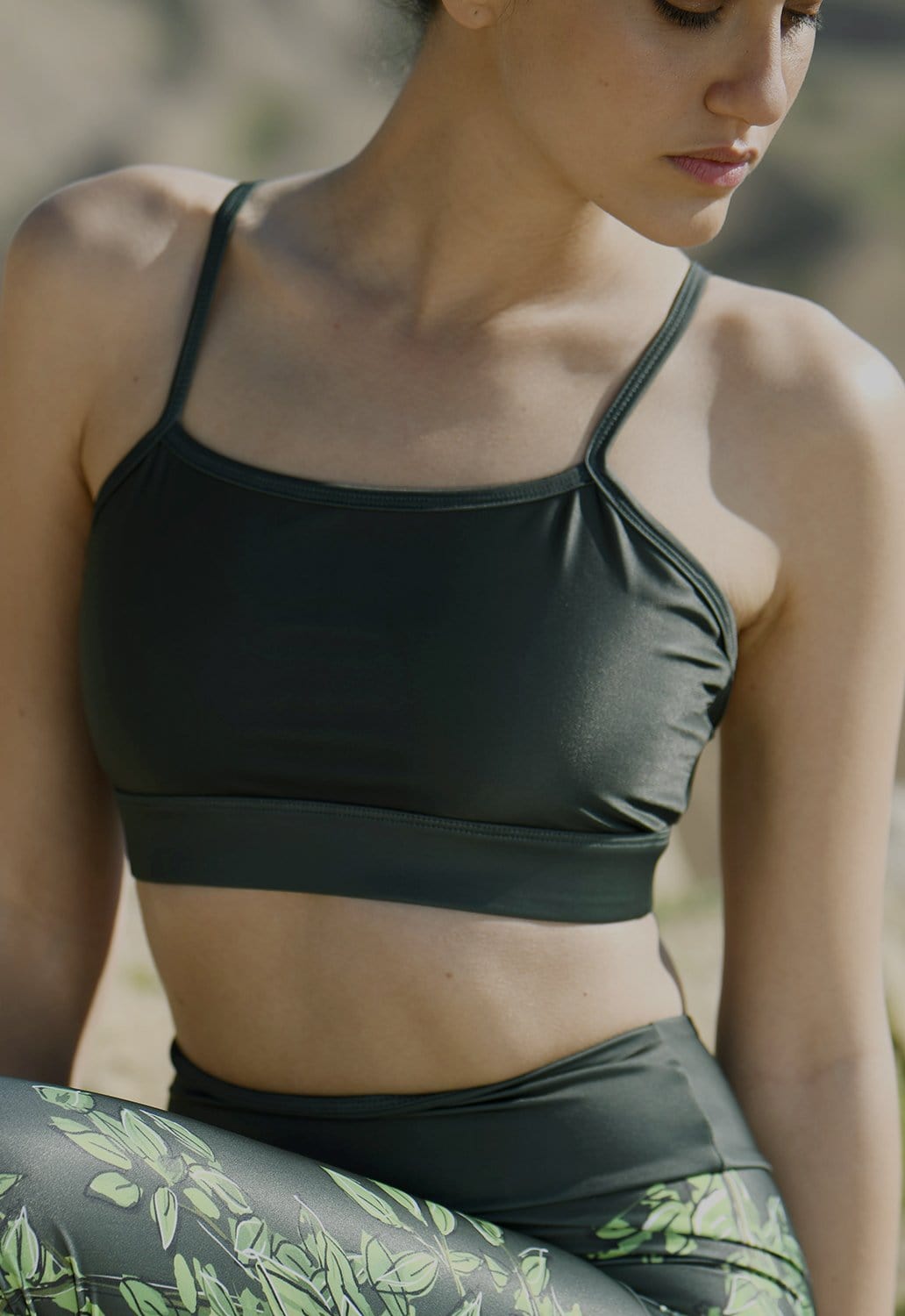 The refined design features thin, feminine straps and a delicate cut-out design on the back. The solid elastic bottom provides extra support and is complemented by an earthy green color.